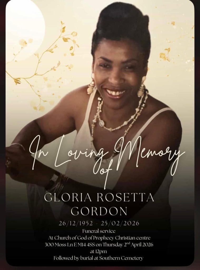GLORIA ROSETTA GORDON April 3, 2026 Funeral, In Loving Memory by Theresa AK Radio Diamond Leave a Comment on GLORIA ROSETTA GORDON GLORIA ROSETTA GORDON Funeral serviceAt Church of God of Prophecy Christian Centre300 Moss Ln E, M14 4SSon Thursday 2nd April 2026at 12pm Followed by burial at Southern Cemetery